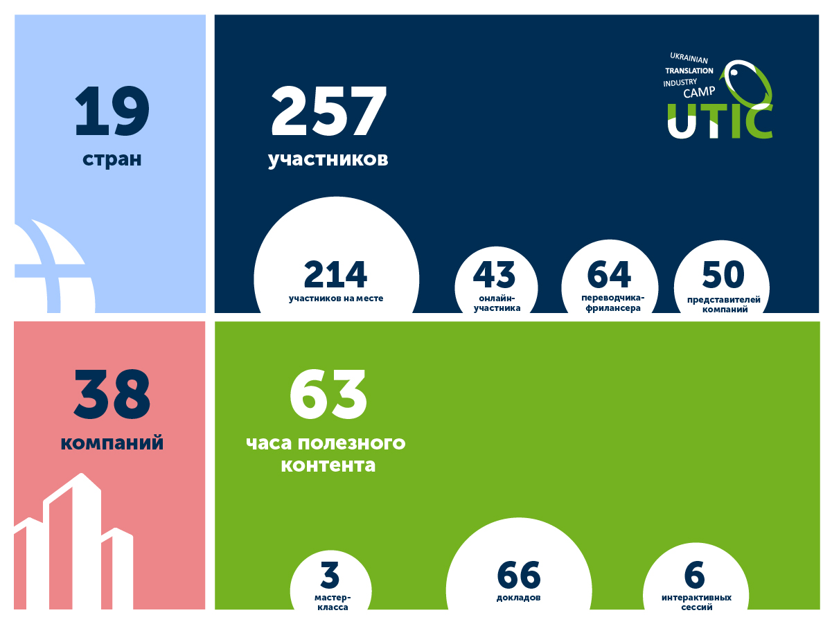 Международная переводческая конференция UTICamp-2019 проходила с 22 по 28 июля в Днепропетровской области, на территории кемпинг-парка «Метеорит» на берегу реки Самара. Судя по количеству и географии отзывов участников и дистанционных слушателей, конференция стала настоящим событием в отрасли. 257 участников из 19 стран мира, 66 докладов в трех потоках (бизнес, технологии и искусство перевода), 6 круглых столов для обсуждения самых актуальных тем — эти цифры говорят сами за себя.